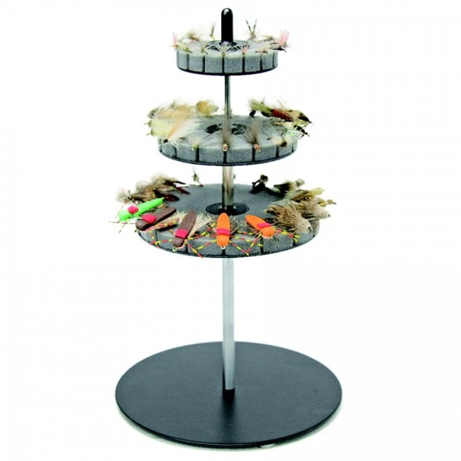 An innovative stand for organized tying or for displaying finished flies. Three Micro Slit Foam Discs of different sizes and pitches are incorporated