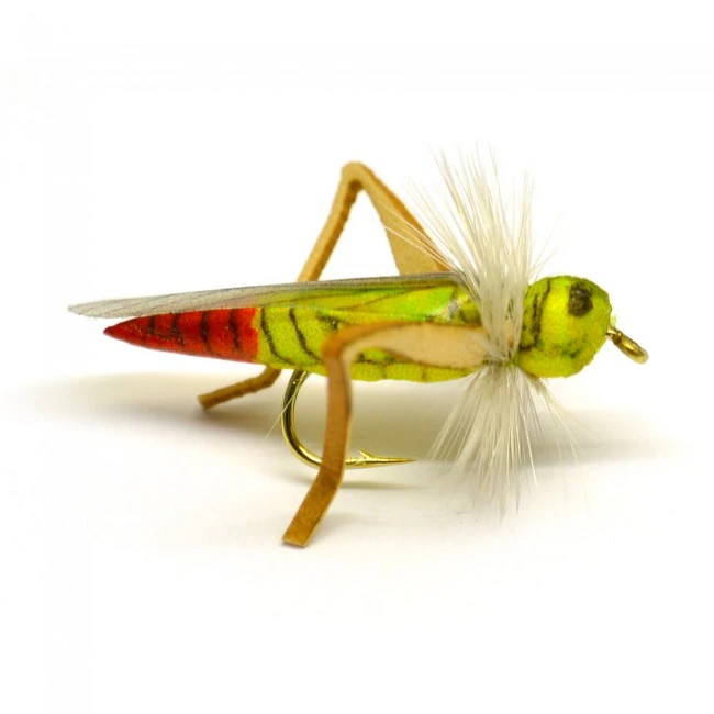 Mycket realistisk imitation av en gräshoppa. En fluga som är speciellt bra i slutet av augusti till sent i september. En fluga som skall finnas i asken om man skall till Nya Zeeland.