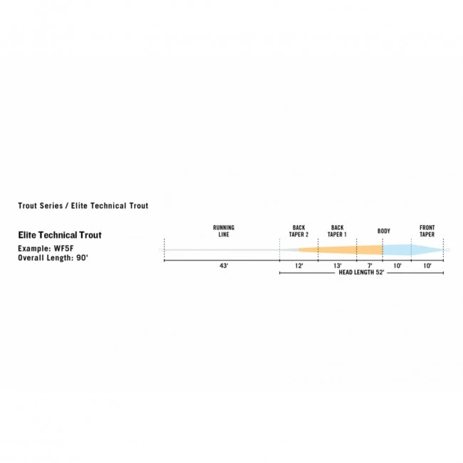 Long front taper turns over flies with delicacy and precision Built with RIO’s exceptionally slick, durable SlickCast Low-stretch ConnectCore Plus for the best in casting control, performance and smoothness Features RIO’s SureFire tricolored measuring system for increased accuracy and distance control Extended head and back taper increases loop control when carrying long lengths of line RIO’s** ELITE TECHNICAL TROUT** line features a long, fine front taper for the lightest of presentations and delicacy and is the ideal choice of line when fishing dry flies, nymphs, soft hackles and emergers to tricky eaters at distance. The line has a long head and back taper to increase loop control when carrying long lengths, and for making precise casts to rising fish, while the weight distribution makes it easy to turn over long leaders for technical feeders at range. The low stretch core provides incredible levels of sensitivity when casting and fshing.