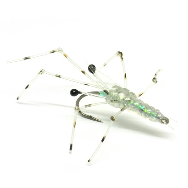 Gummi Shrimp är till stora delar bunden utav transparent Sili Skin, vilket gör att flugas kropp är mjuk. Fördelen med detta är att fisken inte spottar ut flugan lika snabbt. Dessutom ger materialet flugan en transparans som få andra material. Benen som sticker rakt ut från kroppen fungerar som en fallskärm och ser till att flugan sjunker långsammt. En utmärkt fluga vid fiske efter havsöring i klart vatten!